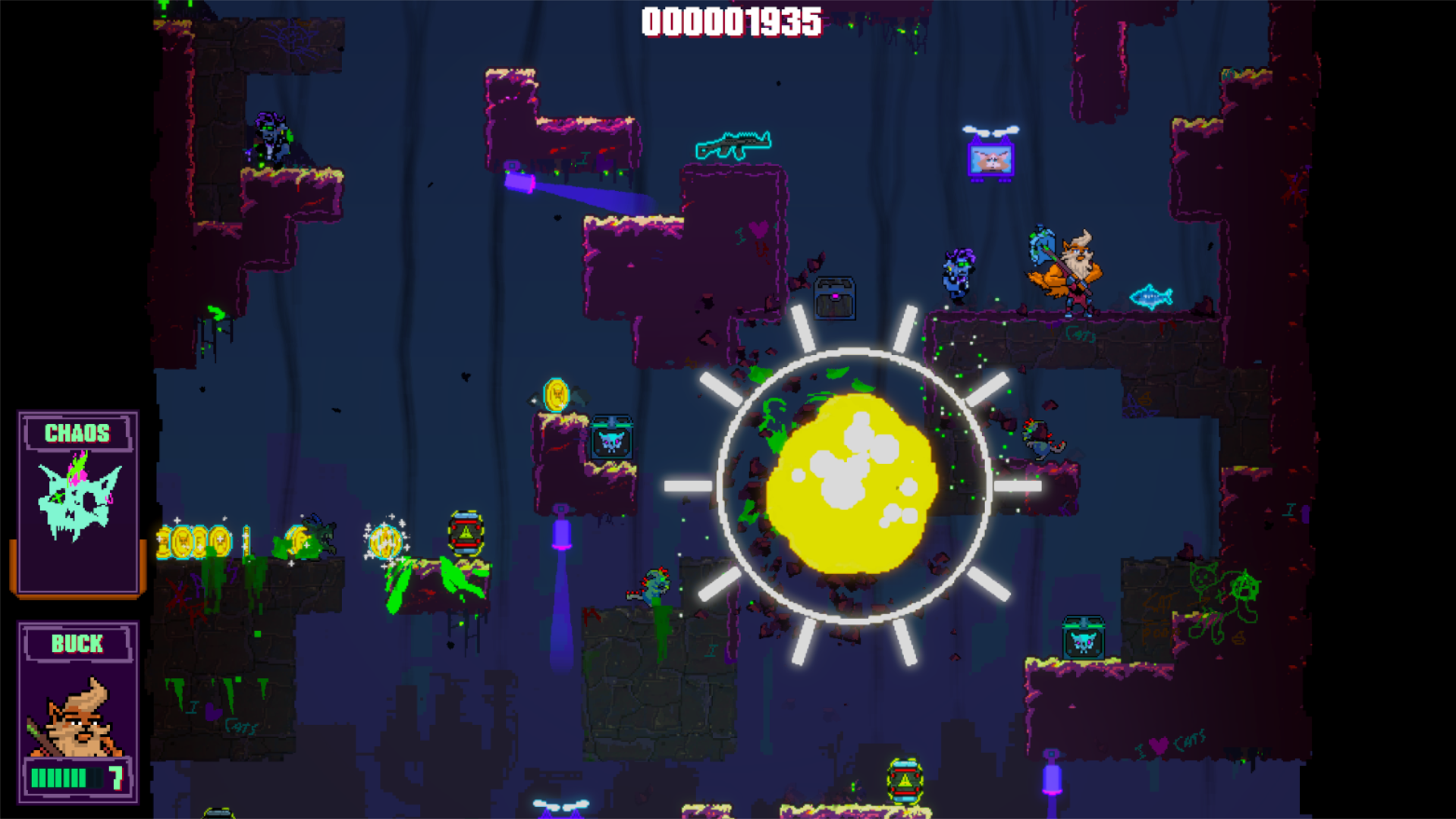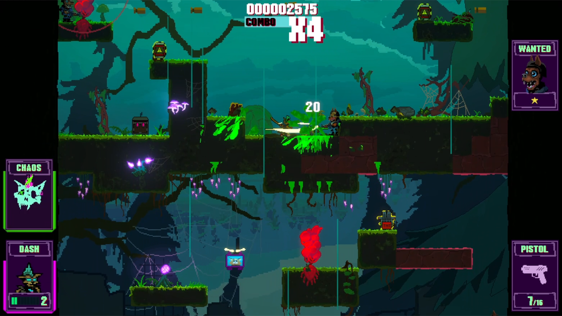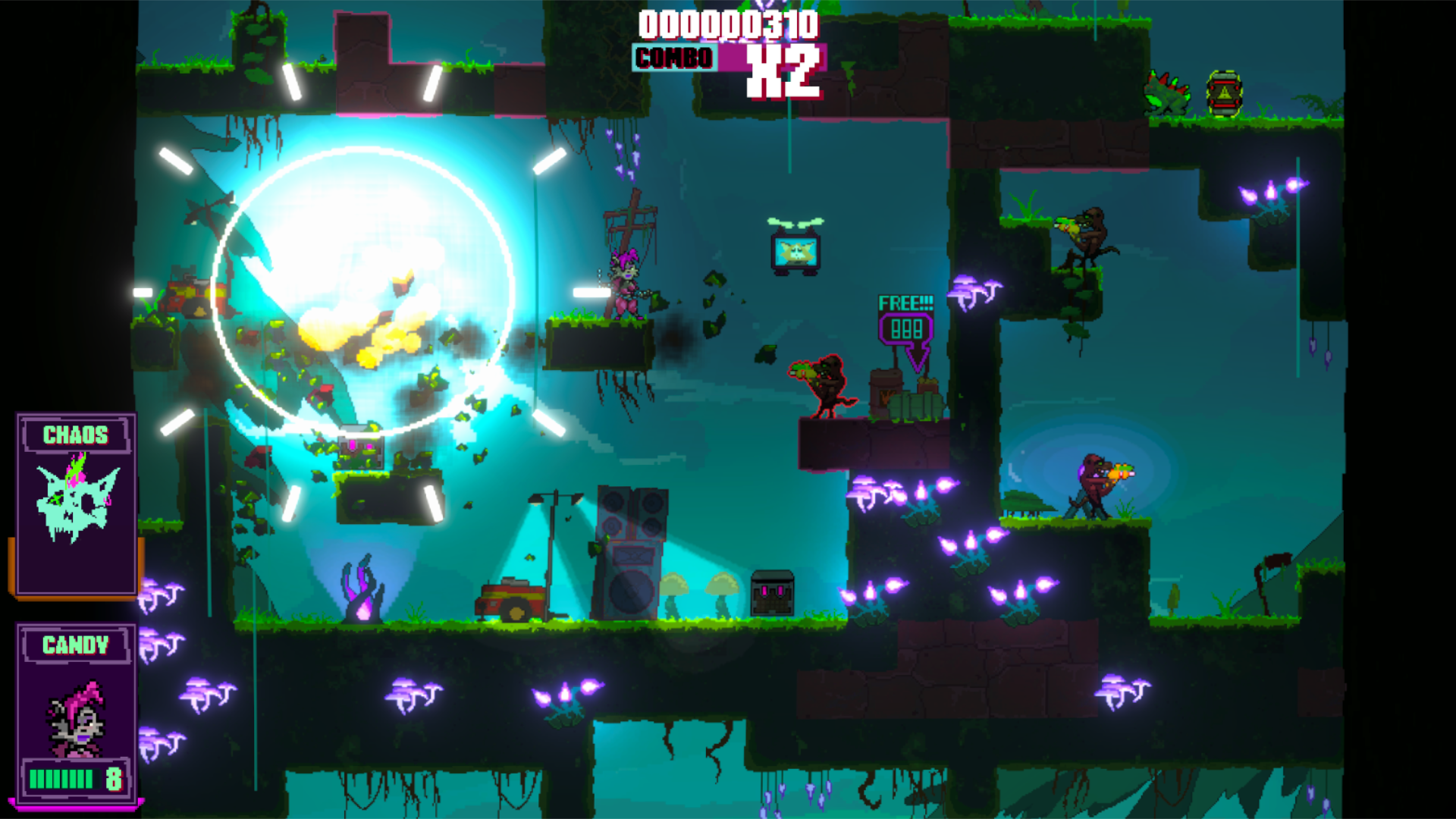 In Clawpunk lassen wir uns durch nichts und niemanden aufhalten und zerstören Gegner und Umgebung. Das Spiel sieht zwar durch seine bunten Pixel recht niedlich aus, doch dass sollte keinesfalls über den Level an Gewalt hinwegtäuschen, den wir hier erleben. Laut Pressetext genauso wie in den 80/90er Jahren. Damals landeten solche Spiele aber 100%ig auf dem Index oder wurden direkt beschlagnahmt, denn da kannte die BPjS kein Pardon. Das machte die Titel auf den Schulhöfen aber umso beliebter.